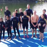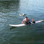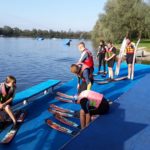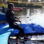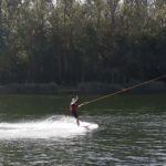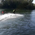 Die Temperaturen von teilw. 12°C auf der Anfahrt schreckten uns nicht ab, war doch herrlichstes Wetter vorhergesagt. Dort angekommen wurden wir herzlich in Empfang genommen, bekamen direkt unsere Neoprenanzüge und nach dem Umziehen eine kurze Einweisung in Form eines Videos. Im Anschluss ging es direkt los. Alle starteten zunächst auf Wasserski. Nach dem ein oder anderen Anfangssturz gelang es allen, ob blutiger Anfänger oder bereits erfahrener Fahrer, schnell mindestens eine Runde zu drehen. Nicht alle schafften es den Ratschlag von Oli um zu setzen und nicht am anderen Ende des Sees zu stürzen. So kam es, dass der Ein oder Andere einen kleinen Spaziergang vor sich hatte.