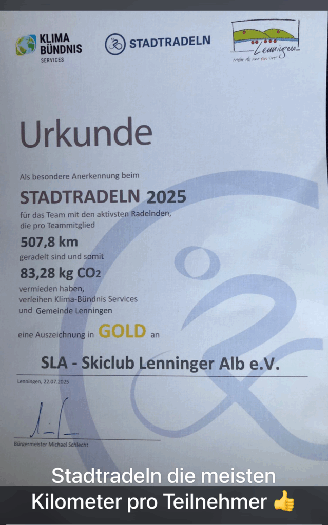 Am 29.07.2025 war die Siegerehrung, wir waren der Verein mit den meisten pro-Kopf-km. Toll Gemacht – Wir sind stolz auf euch und euer großartiges Ergebnis – ihr habt gezeigt, was möglich ist, wenn man gemeinsam in die Pedale tritt!DANKE an Euch, für Euer Engagementund den Erfolg.